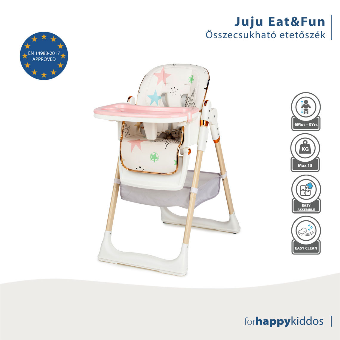 A Juju Eat&Fun étkezőszéket a EN14988-2017 európai szabvány szerint tesztelték és tanúsították, 6 hónaptól körülbelül 3 évig ajánlott, súlya 15 kg, de úgy gyártják, hogy akár 20 kg-ot is elbírjon.