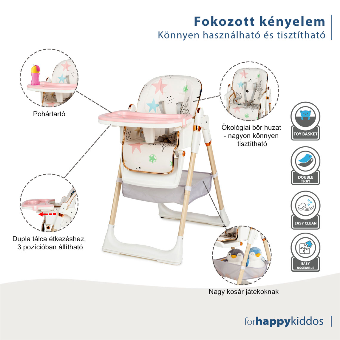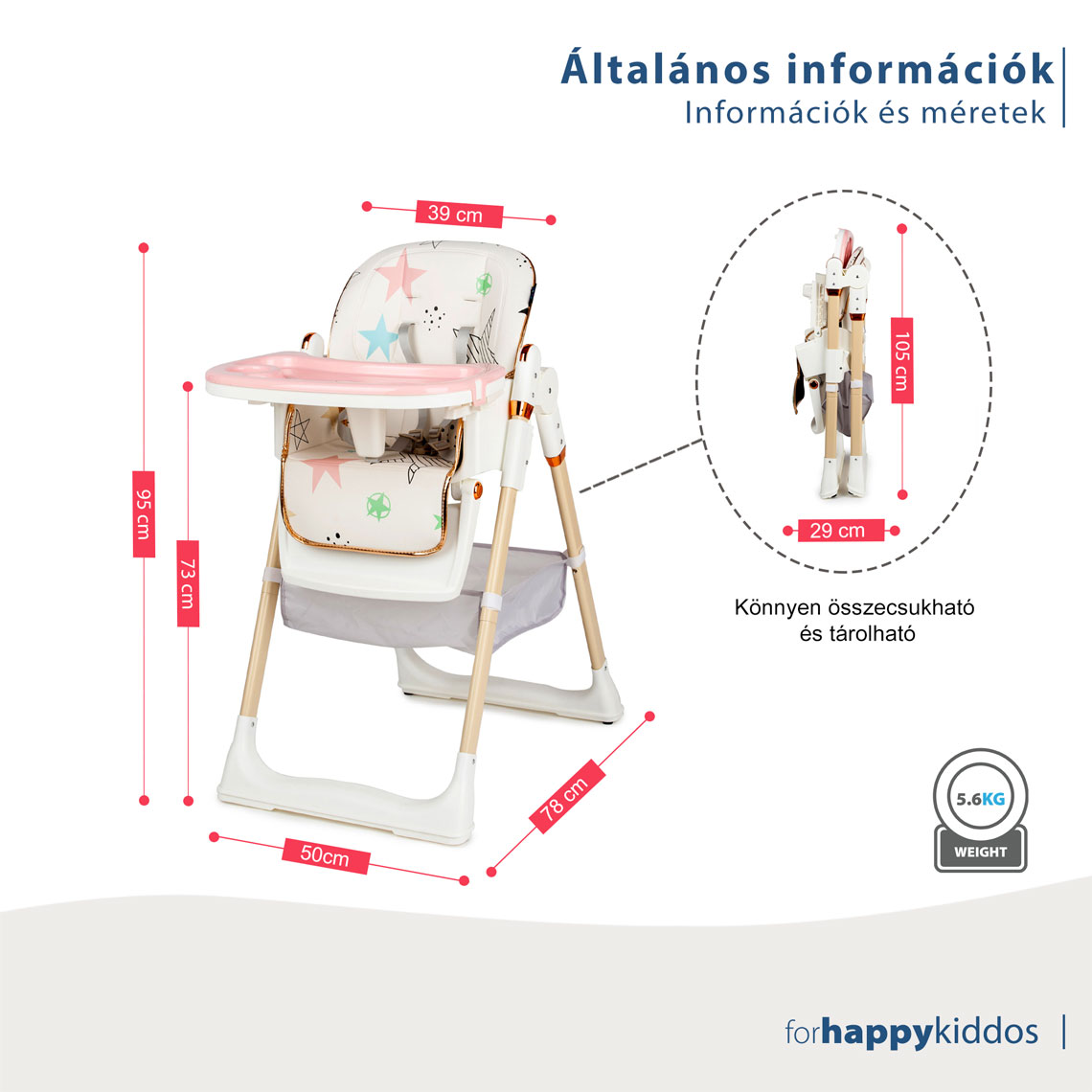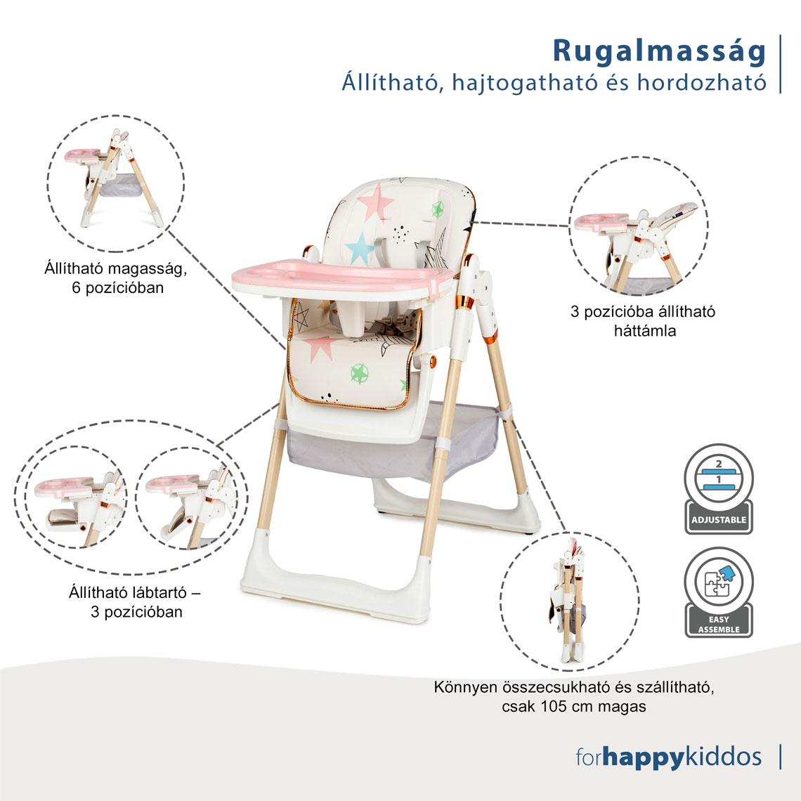 Az ergonomikus és tartós kialakítással rendelkező szék helyes és kényelmes testtartást biztosít a gyermek számára, így minden étkezés kellemes élmény legyen. A hatállású magasságállítás rendkívül sokoldalúvá teszi, könnyen alkalmazkodik a különböző típusú asztalokhoz és növekedési szakaszokhoz. A lábtartó is állítható, extra kényelmet és támogatást nyújtva hosszabb ideig.