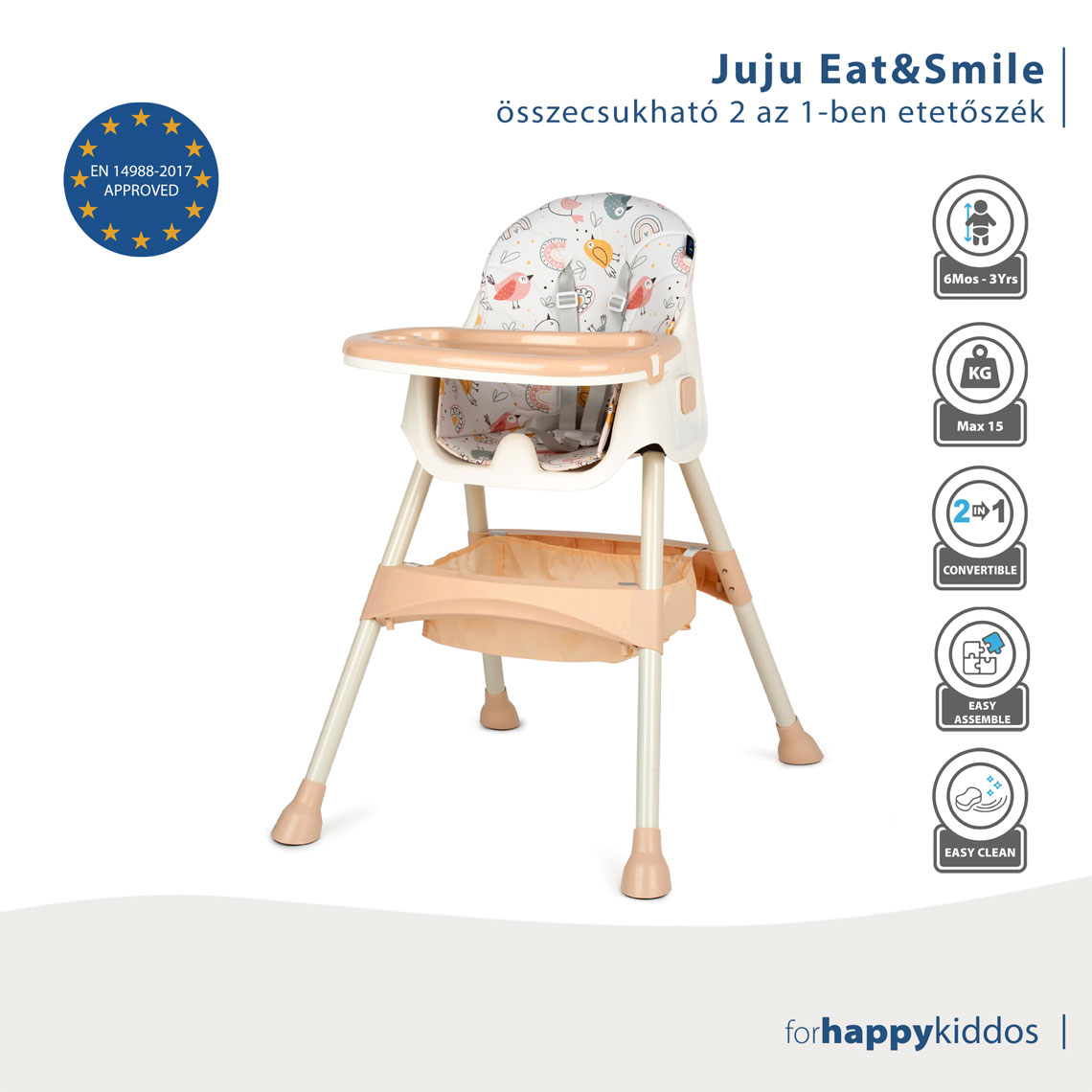 A 2 az 1-ben Juju Eat&Smile étkezőszék a megfelelő választás, amely segít teljesíteni a baba életének 2 alapvető funkcióját: az etetést és a játékot. A szék átalakítható, a levehető lábaknak köszönhetően könnyen és gyorsan felszerelhető a 2 pozíció bármelyikébe. A dupla tálcán van egy rész, amely helyet biztosít az üveg vagy palack számára az etetéshez, és egy egységes rész a rajzhoz, játékokhoz stb. 3 éves kor után az etetőszék külön székként használható, a tálca eltávolításával és a lábak alsó részeinek leválasztásával, és hosszabb ideig használható.