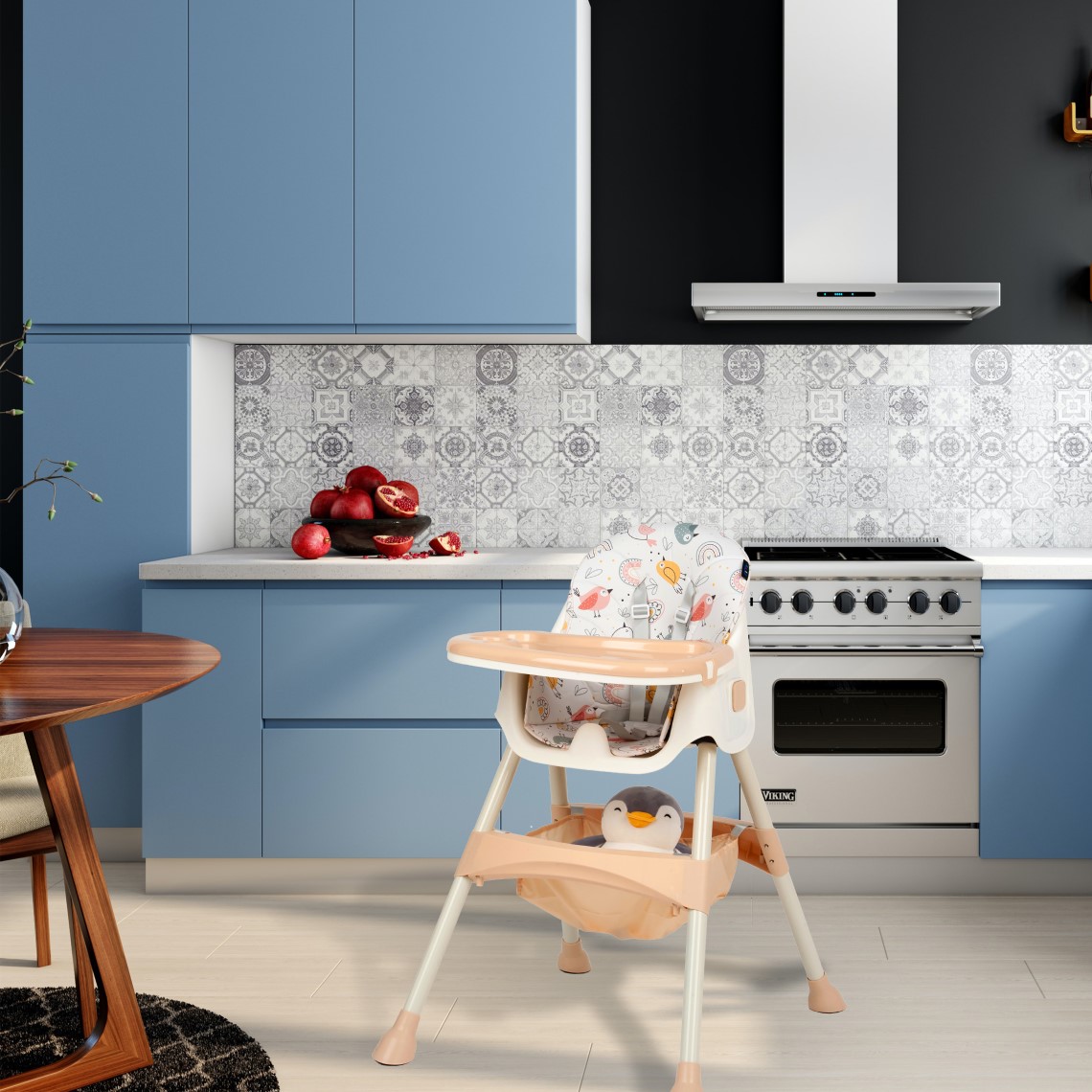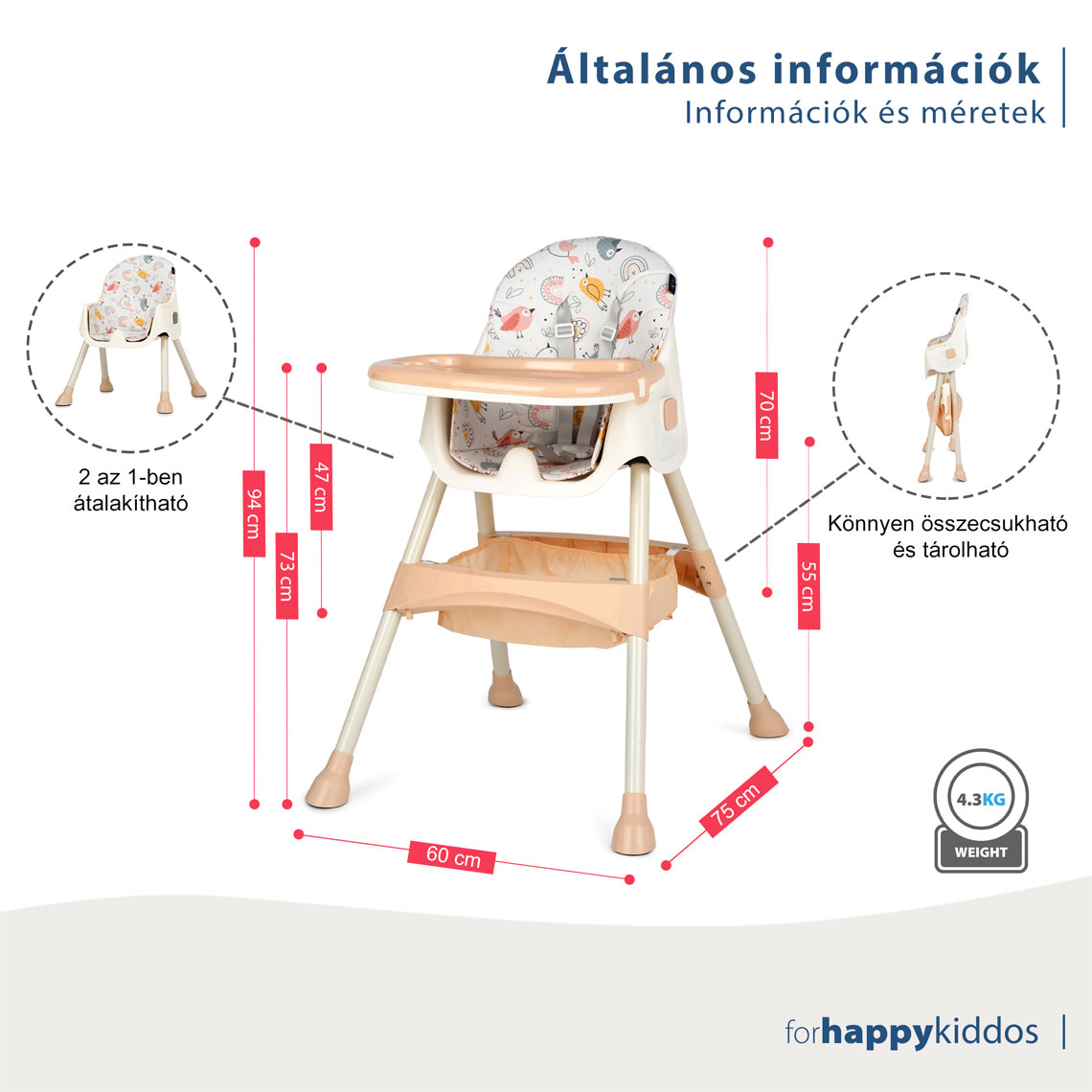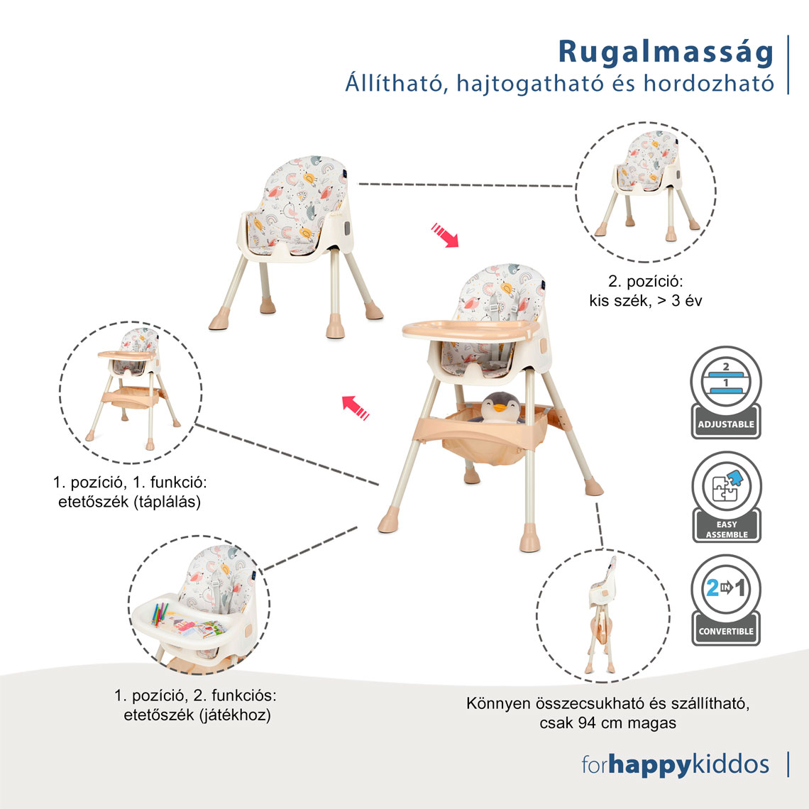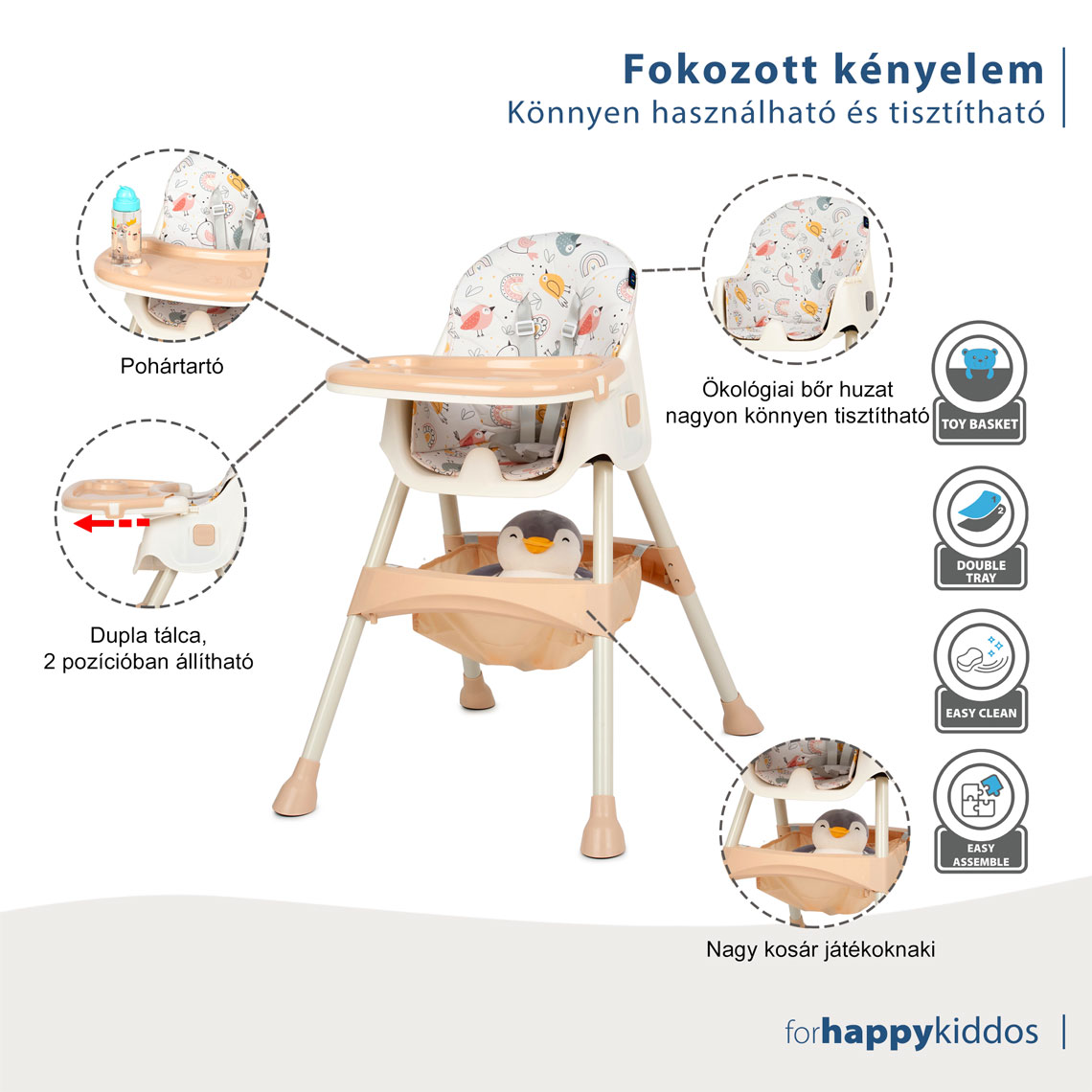- Kivehető tárolókosár, tágas kiegészítők vagy játékok számára, a szék alatt elhelyezve