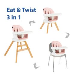 A 3 az 1-ben Juju Eat&Twist etetőszék egy biztonságos és tartós termék, új és elegáns dizájnnal. Ez egy átalakítható etetőszék, amely 3 funkciót lát el: ez egy etetőszék csecsemőknek, egy babaszék és egy asztal magasító. Ennek a modellnek egy másik előnye, hogy 360 fokot forog, 8 forgási pozícióval. A falábak csúszásgátló rendszerrel vannak felszerelve, és lehetővé teszik a szék magasságának beállítását, amelyet könnyedén átalakíthat etetőszékből a játékszékre, az Eat&Twist az ideális ülés hosszabb időre. A Juju Eat&Twist etetőszék az EN14988:2017 irányelvvel összhangban megfelel az Európai Unió jelenlegi szabályainak; EN16120:2012+A2:2016+AC:2017.