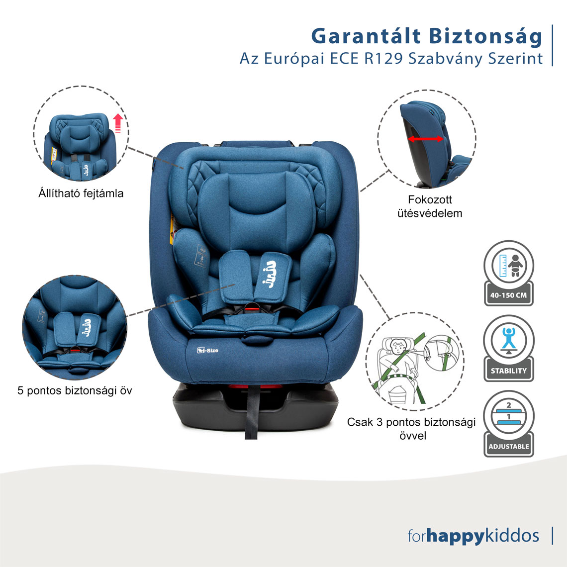 - ECE R129 tanúsítvánnyal, biztonságosabb és erősebb kialakítással, biztosítva a fej és a nyak területének legjobb védelmét, szabványos oldalütközési vizsgálattal