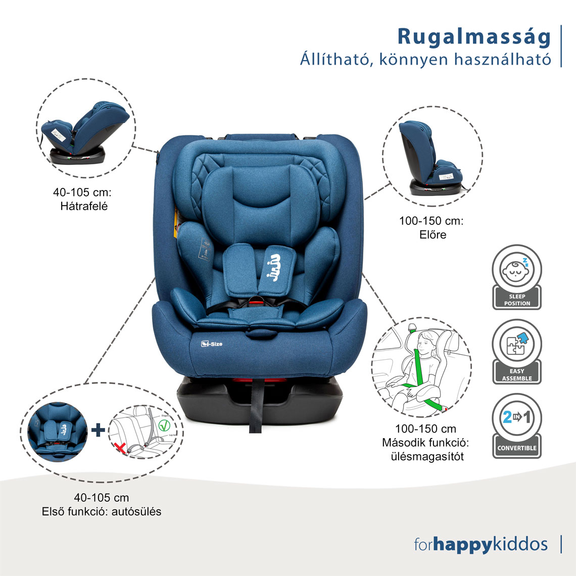 Okos és állítható kialakításának köszönhetően ez az ülés gyermekével együtt változik. Az állítható fejtámla és a kettős funkcionalitás lehetővé teszi, hogy praktikus és biztonságos autós ülésmagasítóként használják, miután a kicsi meghaladja a 100 cm-es magasságot.