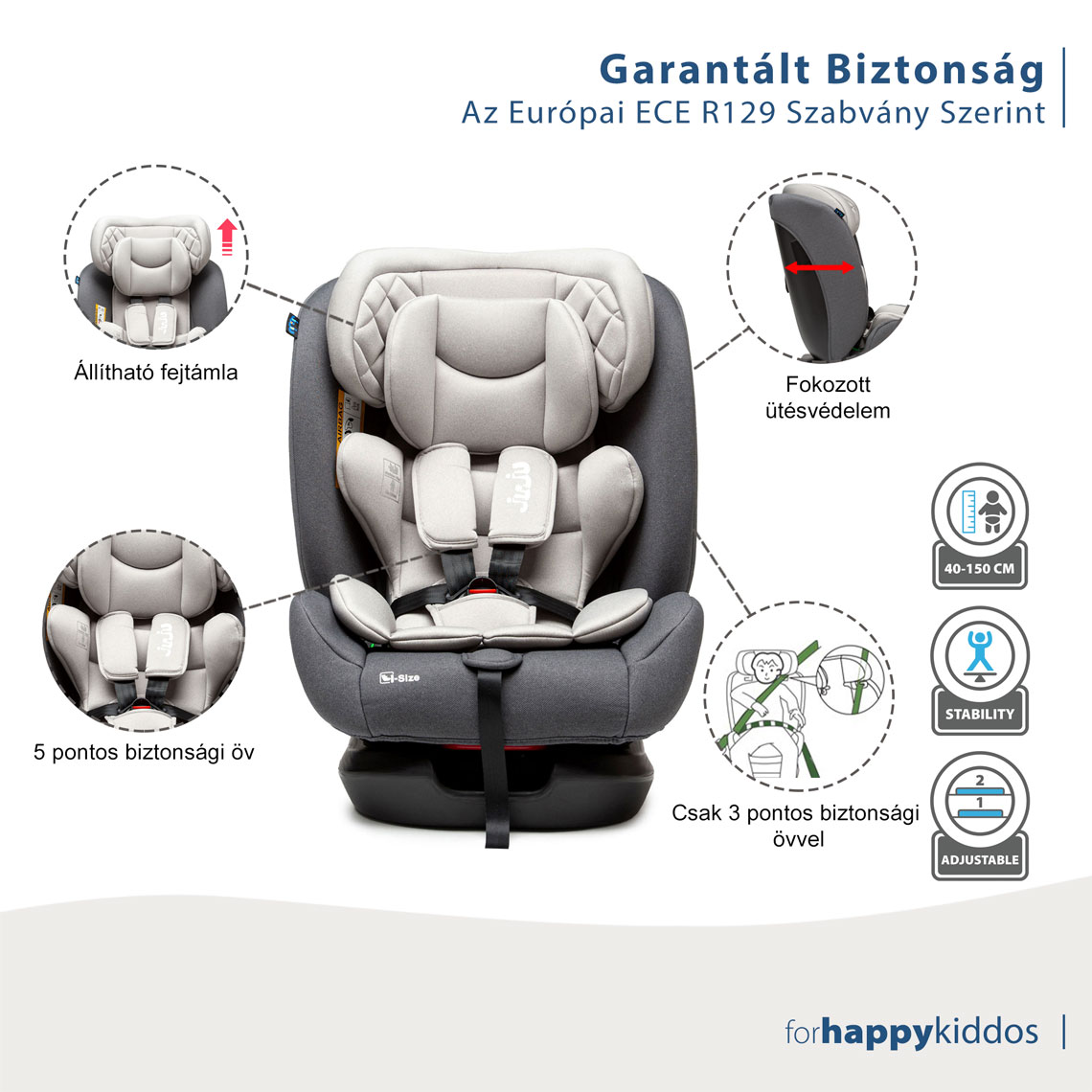 Az ECE R129 szabvány szerint tanúsított modell fejlett védelmet nyújt, különösen a fej és a nyak területén, oldalütközések szempontjából tesztelve, hogy minden utazás a lehető legbiztonságosabb legyen. Először kényelmes autókosárként használható újszülöttek számára, speciális reduktorral (fej- és hátsó párnákkal), amely optimális és kényelmes helyzetet biztosít az élet első napjaitól.