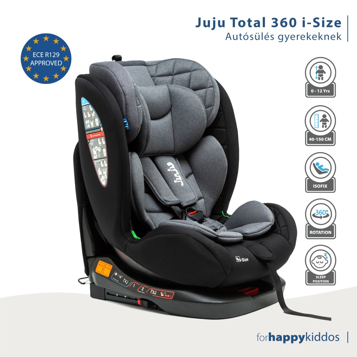 A Juju Total 360 i-Size gyermek forgatható autósülés 40 és 150 cm közötti gyermekek számára ajánlott (születéstől kb. 12 éves korig). Ezt a gyermekülést az ENSZ ECE R129/03 előírása szerint hagyták jóvá, és általános használatra alkalmas járművekben, mivel kompatibilis a legtöbb autósüléssel. A modern dizájn előnyeit élvező szék ugyanakkor összetett termék, amely ISOFIX rendszerekkel van felszerelve Top Tether és 360 fokos elforgatással. A Total 360 i-Size autósülést hosszú távú használatra tervezték, születésétől 150 cm (vagy 12 év) magasságig alkalmas. Felszerelhető menetirányba (menetirányban) és ellenkező irányba (hátrafelé néző), olyan helyzetben, amely a legmagasabb fokú védelmet nyújtja a csecsemők számára, védve a gyermek nyakát, gerincét és fejét. A Total 360 i-Size alvó pozícióval és 360 fokos forgásrendszerrel van felszerelve, amely lehetővé teszi, hogy akár az autó ajtaja felé is elforgatható legyen, ami segít a gyermek kényelmes helyzetbe helyezésében.