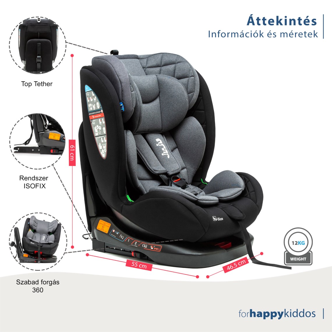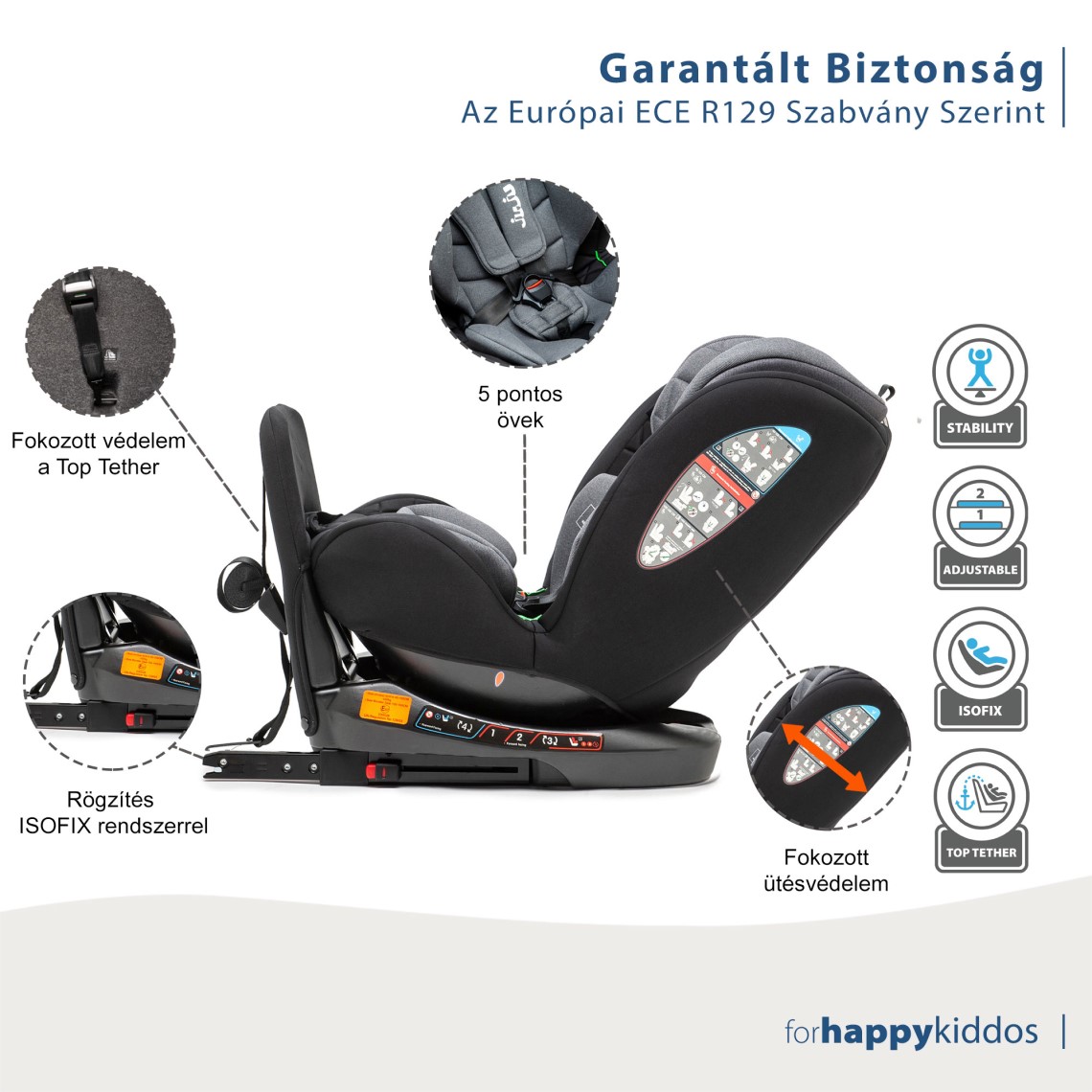- ISOFIX és Top heveder rögzítőrendszer, amely védelmet és fokozott stabilitást biztosít