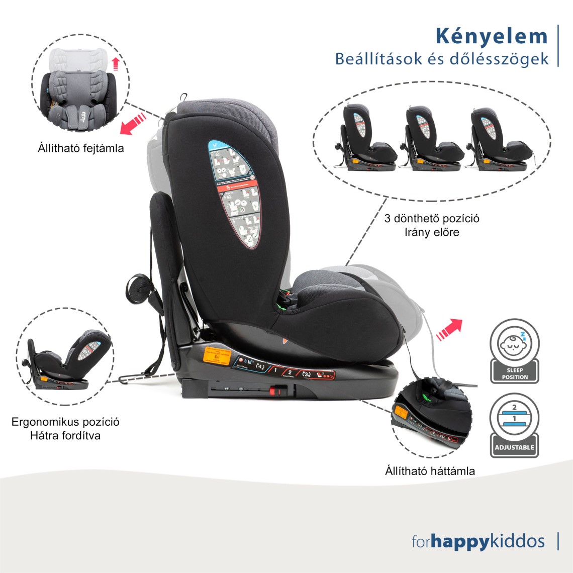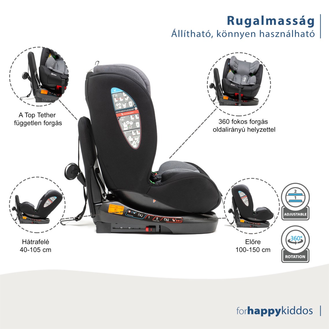 - Beállító rendszer 4 beállítási lehetőséggel: egy pozíció menetiránynak háttal és 3 pozíció menetiránynak háttal történő használat esetén